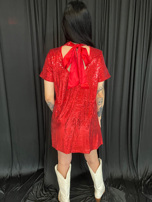 Red Sparkle Sequin Neck Back Tie Mini Dress